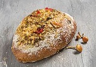 volkoren brood met Gruyère en Comté en kastanjechampignons, pijnboompitten, kruiden, knoflook en koriander.