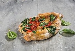 Italiaans witbrood deeg en hebben we gevuld met Mozzarella, geroosterde paprika en spinazie.