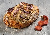 Turks witbrooddeeg hebben gemaakt. Het brood is gevuld met knoflookolijven, buffelmozzarella en zongedroogde tomaatjes.