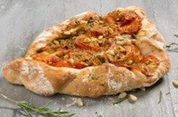 witbrooddeeg met verse groene pesto, gorgonzola-dolce, vleestomaten, kruiden en pijnboompitten